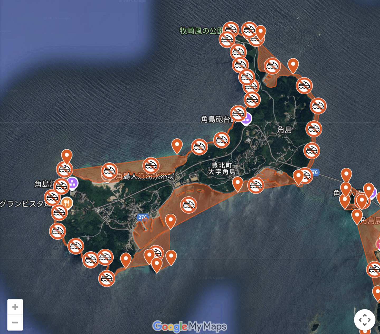 この度、私たちが日本財団より「海と日本プロジェクト 2025」の承認を受け、取り組んだのがマップの作成です。ドローンやアクションカメラを駆使し、豊北町内の注意すべき全ての境界に関する位置情報を取得し、割り出したエリアの座標(経度、緯度)をマップに落とし込みました。
