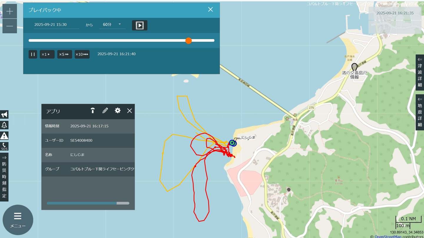 本アプリは、上記のように承認待ちの状態ですが、現状でも水上バイクが航行した航跡データを記録することは可能です。この機能については、もし事故が発生した場合に後から航跡および時間帯を特定することで原因を究明することに役立てることができます。これらのデータが事故の再発防止につながると考えられます。